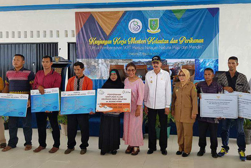 Pada kesempatan tersebut, Menteri Kelautan dan Perikanan RI menyerahkan bantuan diantaranya merupakan realisasi klaim asuransi nelayan 2016 dengan nilai 160.000.000, yang diserahkan kepada pemegang polis asuransi a.n Bujang Hitam berupa klaim pertanggungan nelayan karena kematiam alami yg diterima oleh ahli waris, bantuan premi asuransi bagi nelayan (BPAN) 2017 Kabupaten Natuna kepada 72 nelayan, bantuan berupa 2 unit Kapal Pengangkut ikan 30 GT serta bantuan alat tangkap yang diserahkan kepada beberapa perwakilan koperasi nelayan setempat.