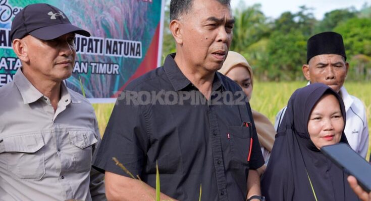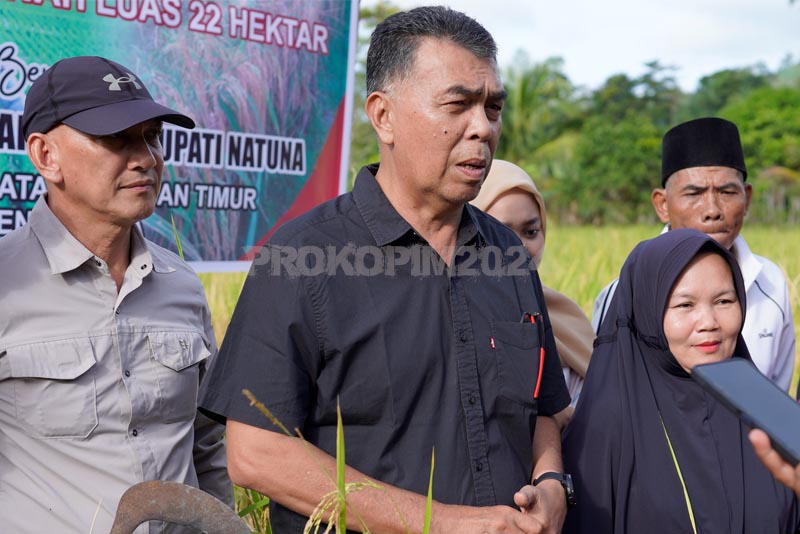Didampingi Wakil Bupati Natuna, Wan Siswandi mengapresiasi usaha masyarakat yang telah menanami sawah dengan padi yang dipanen perdana kali ini, seluas 22 hektar dari 90 hektar lahan yang ada.