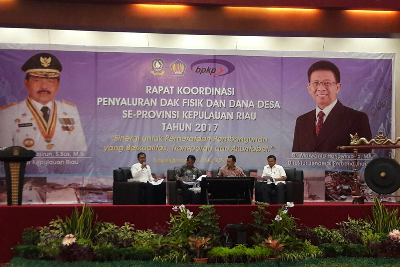 Direktorat Jenderal Perbendaharaan Kementerian Keuangan Republik Indonesia menyelenggarakan Rapat Koordinasi Pelaksanaan DAK FISIK dan DANA DESA Se-Provinsi Kepulauan Riau di Aula Wan Sri Beni Kantor Gubernur Kepulauan Riau tanggal 17 Mei 2017. Hadir dalam Rakor tersebut Wakil Bupati Natuna Dra. Hj. Ngesti Yuni Suprapti, MA bersama-sama dengan Dirjen Perbendahraan Dr. Marwanto Harjowiyono, Sekda Provinsi Kepri, Kepala Kanwil KPPN Prov Kepri, Kepala BPKP wilayah Provinsi Kepri serta undangan dari Kepala OPD Provinsi dan Kabupaten Kota di Provinsi Kepulauan Riau.