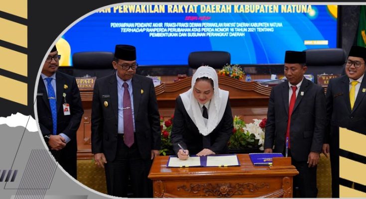 Natuna Regent, Cen Sui Lan, accompanied by Vice Regent Jarmin, SE, attended the Plenary Session of the Regional People’s Representative Council (DPRD) of Natuna Regency held on Friday (18/7). The session focused on the final opinion of the council’s factions regarding the Draft Regional Regulation (Ranperda) on Amendments to Regional Regulation Number 16 of 2021 concerning the Formation and Structure of Regional Apparatus.