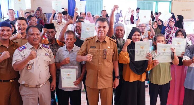 The Regent of Natuna, Wan Siswandi, attended the Handover of Land Certificates for the Complete Systematic Land Registration (PTSL) Programme for Fiscal Year 2023, Tuesday (12/12) morning, at the Bandarsyah Village Office Hall, Bunguran Timur District.