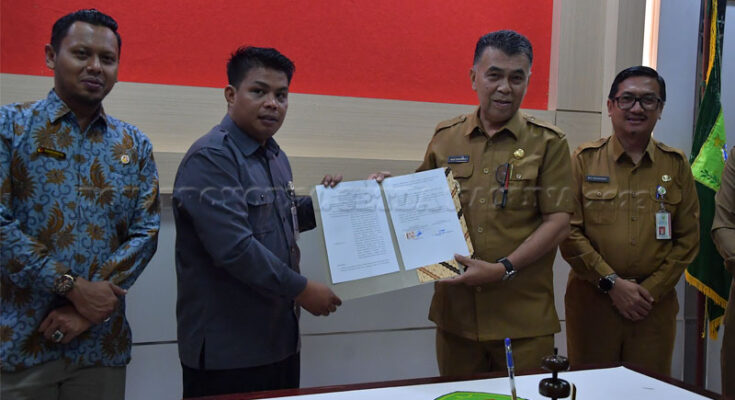 The Regent of Natuna, Wan Siswandi signed the Regional Grant Agreement Script (NPHD) for the 2024 Simultaneous Elections with the Natuna Regency KPU and Election Supervisors which was held in the Meeting Room of the Natuna Regent's Office, Jalan Batu Sisir Bukit Arai, Monday (23/10) morning).