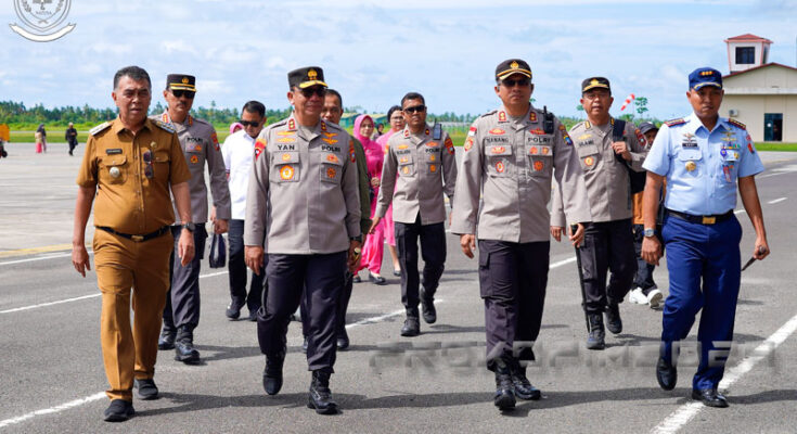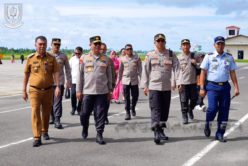 Tuesday (02/07) Morning, the Regent of Natuna, Wan Siswandi accompanied by the Chairperson of the Natuna Regency PKK Team welcomed the arrival of the Riau Police Chief, Inspector General. Pol. Drs. Yan Fitri Halimansyah, M.H at Raden Sadjad Airport Ranai.